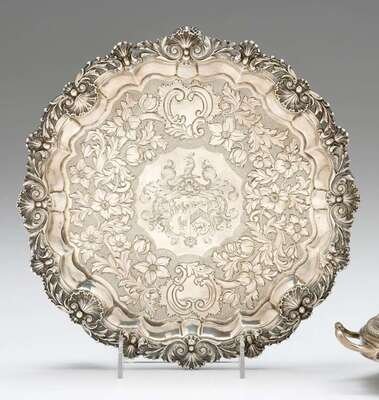 Shaped circular form with applied border of shells and foliage, the field engraved with a foliate wreath and arms, raised on three bracket feet.