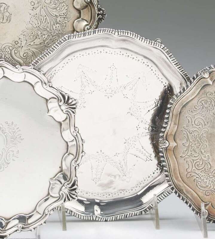With a wavy gadrooned border, the center engraved floral swags, raised on pad feet.