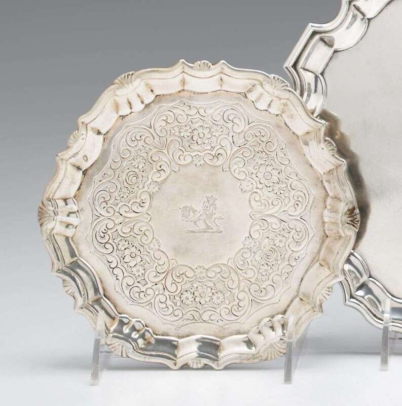 The shaped circular top chased with floral scrolls and engraved crest, raised on three hoof feet.