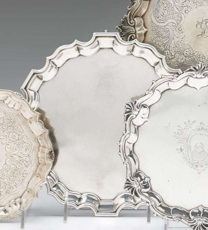 With a Chippendale border, no monogram, raised on three scroll feet.