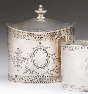 Oval with engraved bands and foliate swags, the hinged cover surmounted by an urn finial.