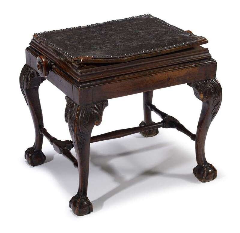 The later tooled leather top and molded edge seat fitted with an adjustable iron mechanism stamped 'H. Brooks/ Patent/ England', raised on acanthus carved cabriole legs joined by a turned H-form stretcher and terminating in claw and ball feet.