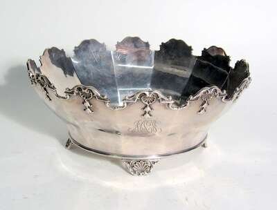 Oval, with a scalloped shell cast rim above paneled sides, raised on an oval foot with pierced shell-form feet.