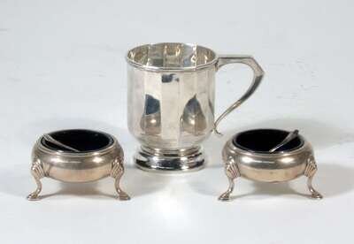 Comprising a presentation Christening cup, Birmingham, W. Neale & Son Ltd., early 20th century, in fitted case; and a pair of George III style open salts with cobalt blue glass liners. (3).