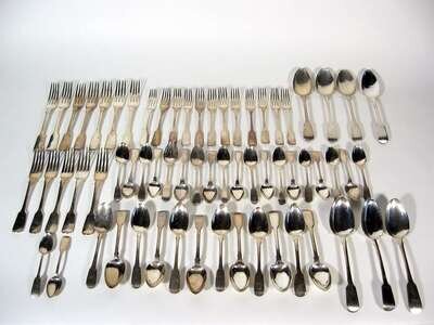 Comprising six dinner forks, Elizabeth Eaton, London, 1846; four luncheon forks, Joseph II & Albert Savory, London, 1846; twelve teaspoons, Charles Boyton, London, 1855; three Sheffield teaspoons with maker's mark 'JR', two serving spoons, Joseph Rodgers, Sheffield and six sterling butter knives; together with two silver plate serving spoons, a set of 12 ivorine handled dinner knives, a sterling handled dinner knife.