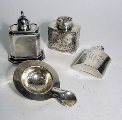 Comprising a Queen Anne style tea caddy, Crichton Bros, London, 1912; a monogrammed hip flask, marks rubbed; a French silver tea strainer; and an unmarked repousse tea caddy. (4).