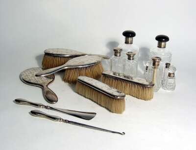 Comprising a two hair brushes, 2 clothes brushes and hand mirror by Elkington, London, 1909, pair of cut glass, silver mounted scent bottles, 6 smaller scent bottles, boot lacer and shoe horn. ( 13).