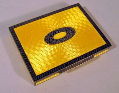 Rectangular, the yellow enamel cover with a black border and centered by a pierced oval panel; stamped '2465' and 'sterling' an unknown maker's mark.