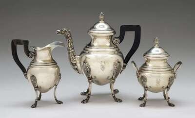 Comprising a coffee pot, sugar bowl and cream jug; the coffee pot with an eagle's head spout and domed lid with berry finial; all raised on animalistic legs ending in paw feet, stamped '800' and 'UM'. (3).