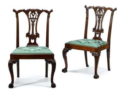 The foliate carved serpentine crest rail supported by a foliate carved and interlaced pierced splat, above a drop-in seat over plain seat rail, raised on acanthus carved cabriole fore legs with ball and claw feet and outswept rear legs.(2).