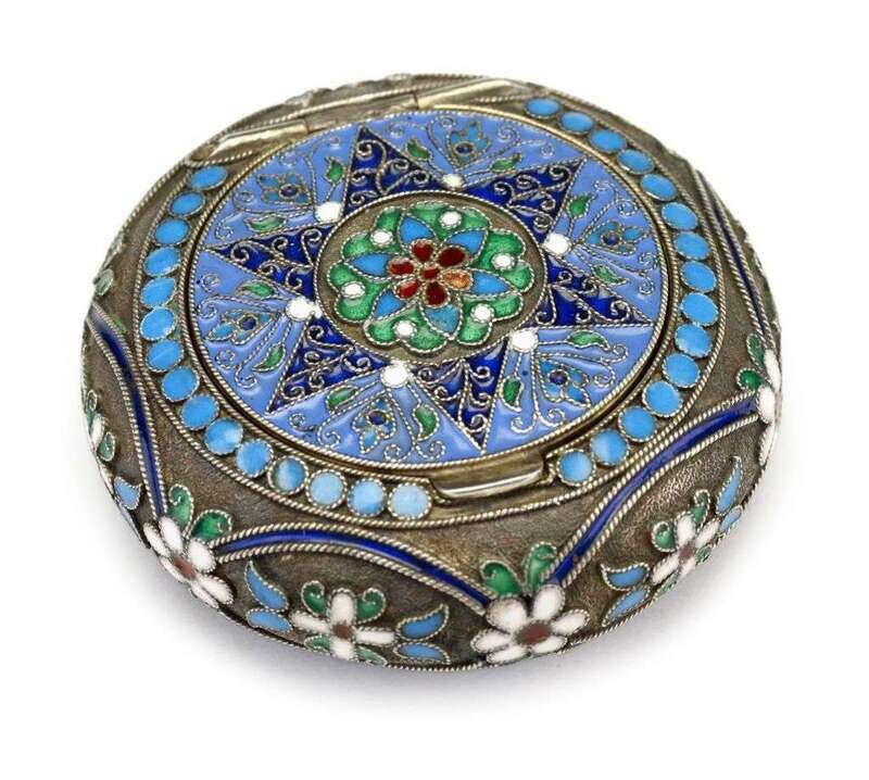 Circular, the hinged top enameled with a star motif in blue and green, the body with flowers, stamped 88 standard.