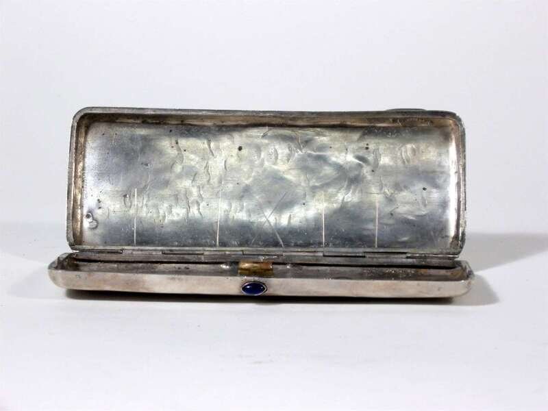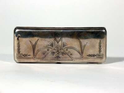 Rectangular, the cover etched with flowerheads and geometric designs, impressed '84' and maker's mark.