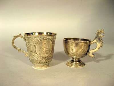 The larger engraved with oval reserves depicting the Kremlin and a basilica, with a barbed loop handle, stamped Moscow, 1887; the other example with a Cyrillic inscription with a barbed loop handle, stamped St. Petersburg, maker's mark 'JR', both 84 standard. (2).