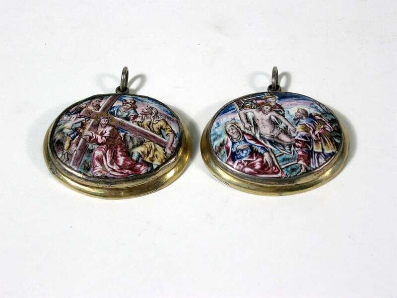 Oval, one depicting the Deposition of Christ, the other Christ carrying the cross, mounted in silver, Cyrillic maker's mark 'NO'. (2).