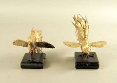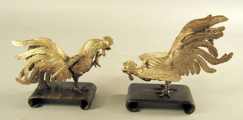 Each in a fighting pose, mounted to scrolled hardwood bases. (2).