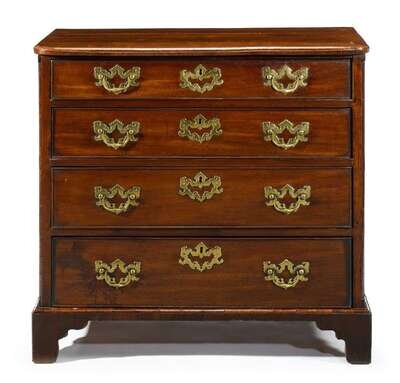 The molded rectangular top over a four cock-beaded graduated drawers with brass handles and escutcheons, raised on shaped bracket feet.