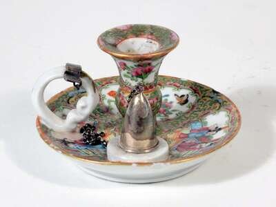 Chinese Export rose medallion porcelain and silver plate mounted chamber stick 19th century