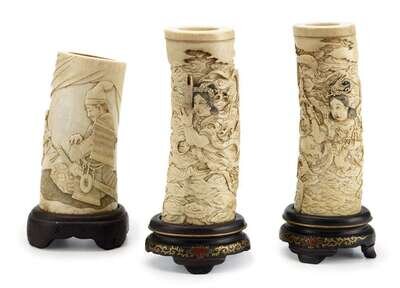 Group of three Japanese carved ivory brush pots meiji period, (1868-1912)