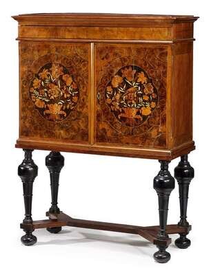 William & Mary style walnut oyster veneer and marquetry chest on stand 19th century