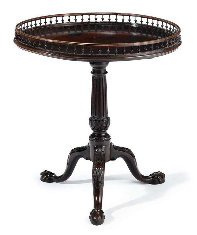 The circular top with a baluster rail gallery, supported by a tapering fluted column and gadrooned urn base, raised on acanthus carved cabriole legs terminating on claw and ball feet.
