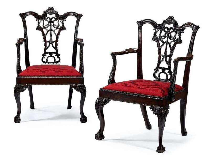 The carved serpentine crestrail supported by ribbon tied pieced splat, continuing to acanthus carved scrolling arms, above a wide drop-in seat and gadrooned seat rail, raised on bellflower carved forelegs and outswept rear legs.(2).
