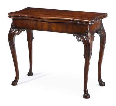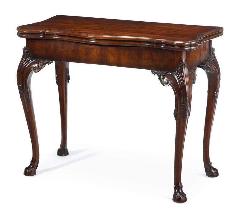 The shaped rectangular fold-over top with a concertina extending mechanism stamped H. Tibats, opening to a tooled leather surface, above a plain frieze, raised on acanthus carved cabriole legs terminating on a hairy hoof feet, the interior with 'Stair & Co.' paper label.