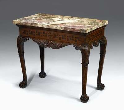 The rectangular breche marble top over molded edge and wide key carved frieze centered by foliate square medallion, above a shell carved apron with a stippled ground, raised on acanthus carved stiff cabriole legs terminating on claw and ball feet.