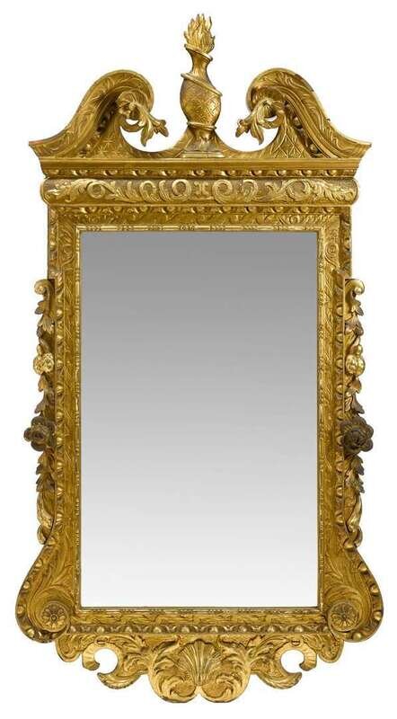 The double scroll pediment centered by a flaming urn finial above a rectangular mirror plate, set in a giltwood frame exuberantly carved with rose trails, scrolls and acanthus.