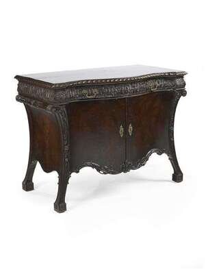 The serpentine shaped top with a gadrooned edge above a rococo and gothic relief carved frieze with one long drawer, above a pair of cupboard doors enclosing shelves and with foliate carved aprons, raised on outswept supports terminating in Greek key carved block feet.