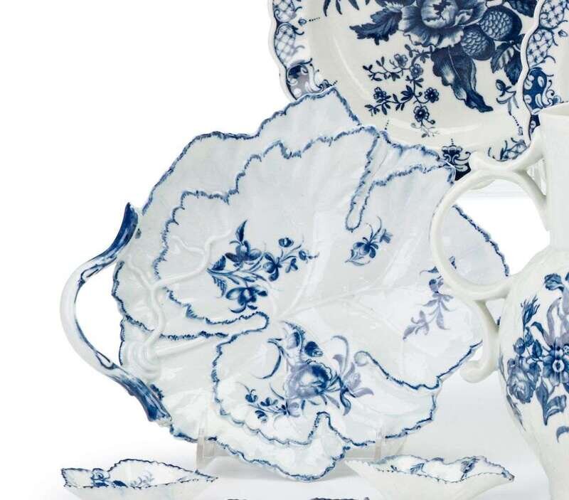 With a twig handle leading to a double cabbage leaf body, painted in blue with foliate sprays, blue crescent mark.