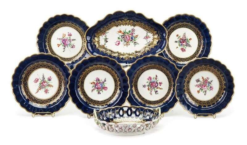 Comprising an oval center bowl, a pierced basket and 6 dessert plates; each centrally painted with a floral bouquet enclosed in a gilt accented scalloped cobalt border; the basket with applied flowerheads to the outside and two stem handles. (8).