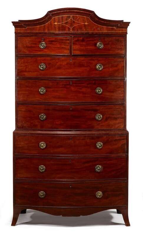 In three parts; the arched inlaid cornice above bow front chest of two short and three long drawers; the lower part with three further long drawers, with a shaped apron and raised on splayed feet.