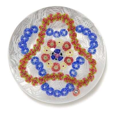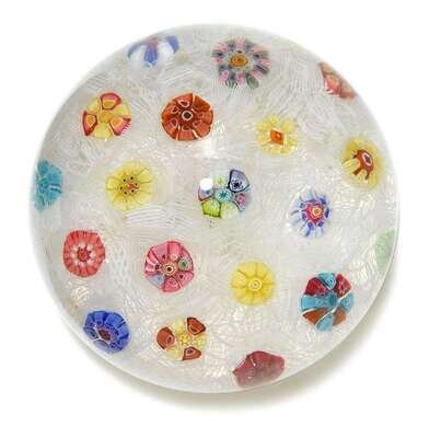 Comprising two scattered filigree with multiple canes on a lace ground, date canes for 1968 and 1969; a special filigree with blue and pink/green garlands on a lace ground, 1969 date cane; and a macedoine example in pink, blue, green, white and orange; etched marks.(4).