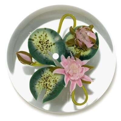 The first with two red raspberries, one green raspberry, two flowers and a bud with leaves, no. 0017, dated 1991; the other with two pink water lilies and one bud with three leaves, no. 0019; both in clear glass signed Jim Donofrio.(2).