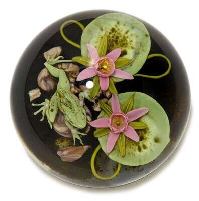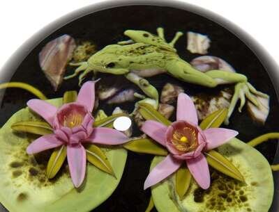 Composed of a green frog on rocks beside two large lilypads and pink waterlilies, on a mossy green ground, signed Jim Donofrio, no. 0224, dated 1992.