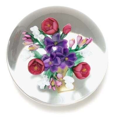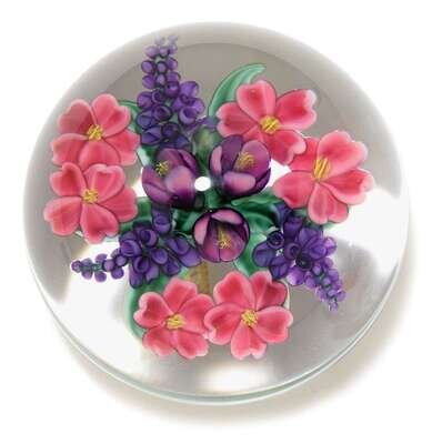 The first with three purple crocus, three lilac spears and six pink cinquefoils with leaves, in clear glass; the other with three purple cinquefoils, three pink crocus and white and pink sprays, in clear glass; initial 'G' cane, signed and dated 1988 and 1990.(2).