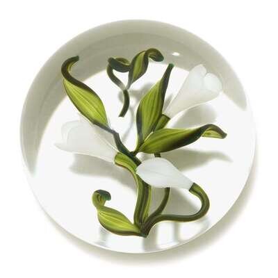 The first with two red strawberries, one green berry, and a blossom on a vine with leaves, on a green ground, signed GES and dated 1984; the other with three white lilies and four leaves and stem, in clear glass, signed GES and dated 1985.(2).