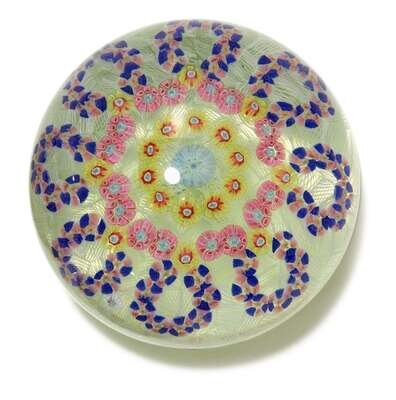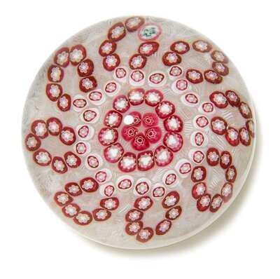The first in red and white on a muslin ground, 1972 date cane, no. 545; the next in pink, red and blue on a muslin ground, 1972 date cane, no.368; the final with blue and pink garland with yellow and pink cane ring, on a lace and pale green ground, 1971 date cane, no. 121; etched marks.(3).