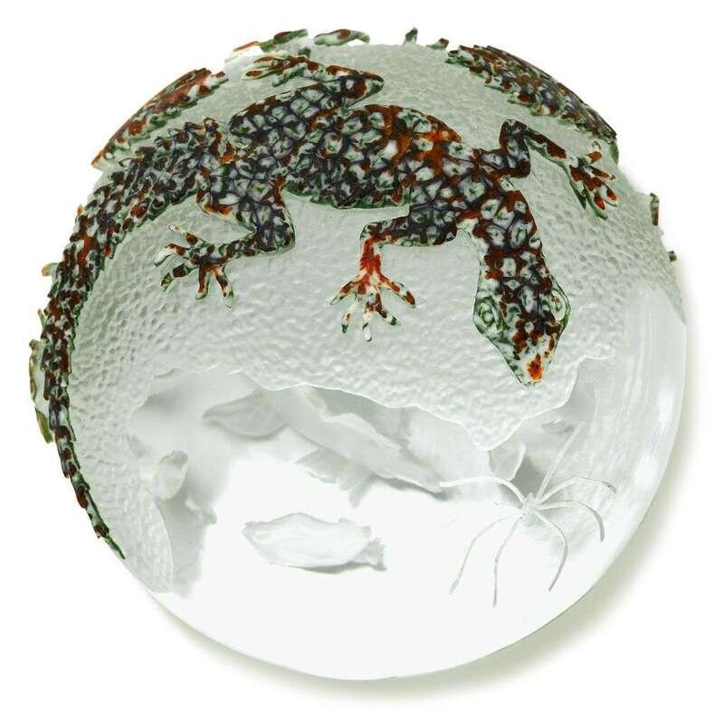 Clear and textured glass with in-sculpture of a fish and rocks, the exterior with an engraved spider and cut in relief with a lizard and plants in red, green and white.