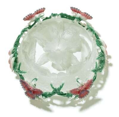 Quadruple encased diatreta in white, green, pink, and lavender, carved as a wreath of orchids; the interior with cameo cut orchid and leaves in clear glass.