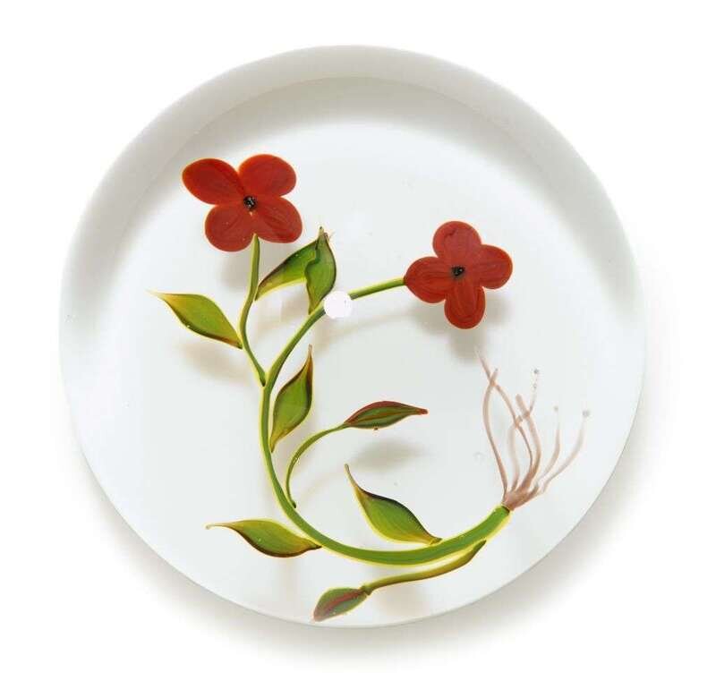 Two four petal red flowers from a stem with eight stems and exposed roots, on a white ground, white and black initial 'PS' cane, no. A344, dated 1973. Edition of eight.