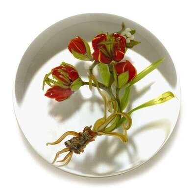 Two red flowers and two red buds, on stems with flowers and exposed roots, in clear glass, white and black initial 'S' cane, no. C035, 1986.