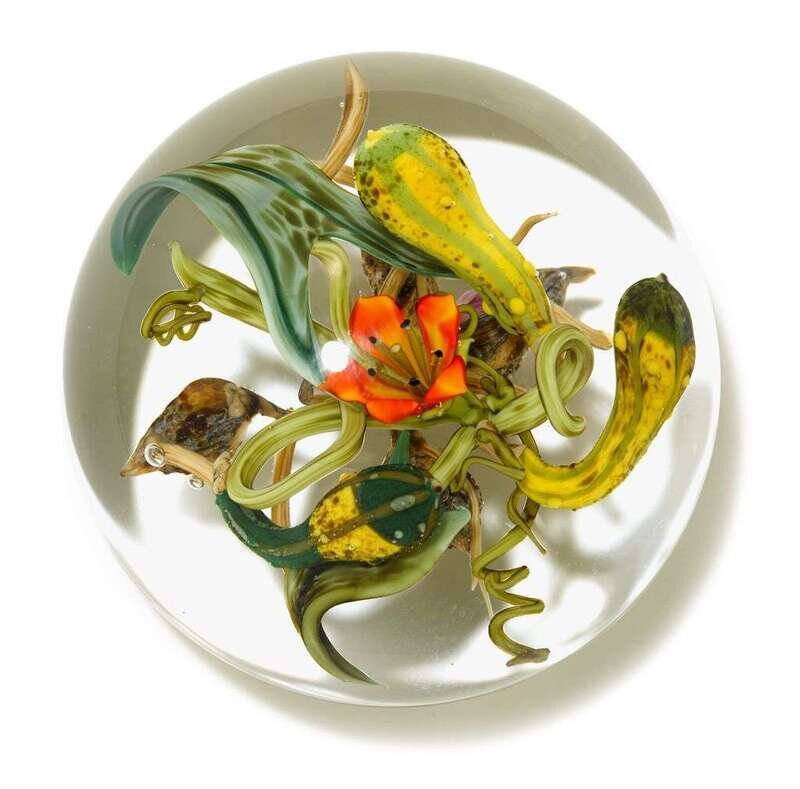 Three gourds and one orange blossom on a vine with leaves and exposed roots, in clear glass, white and black initial 'S' cane, no. C110, dated 1986.