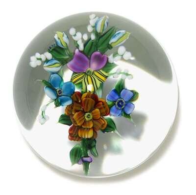 With a purple and yellow pansy, a brown flower, two blue flower, four buds, white sprays and leaves, signature DT cane, in clear glass.