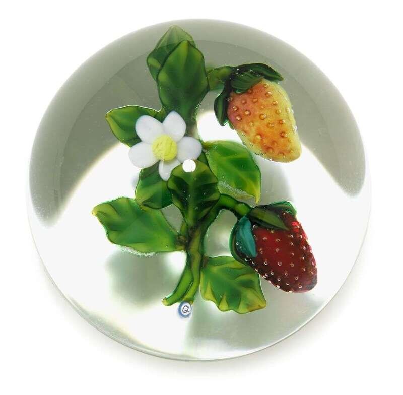 With one ripe and one unripe berry and a single flower on a leafy stem, in clear glass, white and black 'DT' cane.