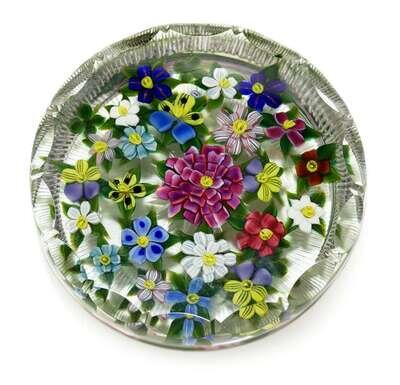 Featuring twenty three flowers in pink, blue, white, yellow, lavender and blue, with leaves, in clear glass with a facetted rim and star cut base, white and black initial 'DT' cane.