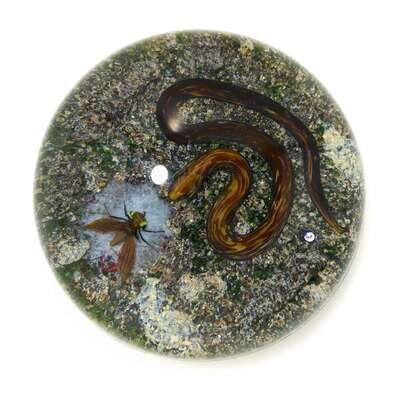 Composed of a brown coiled snake and a fly on a rocky ground, white and black initial 'DT' cane.