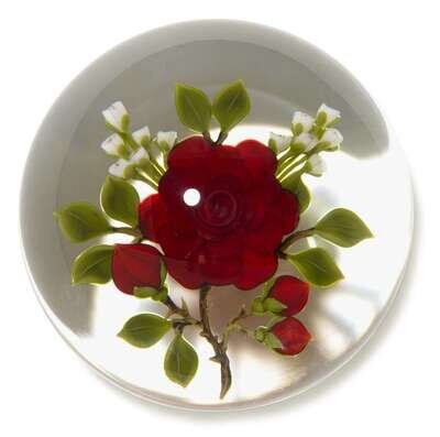 With one large red rose and three buds, leaves and stems, with twelve small white flowers, in clear glass, initial 'VT' cane, signed Trabucco 1993.