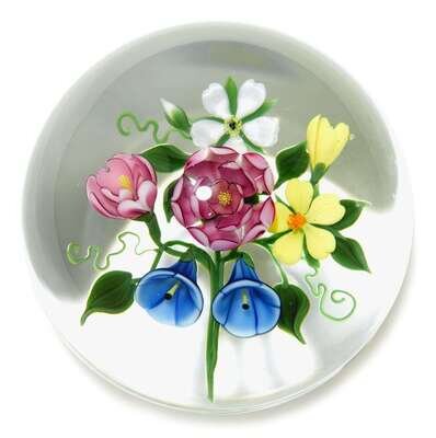 Bouquet with two pink roses, two blue morning glory, two yellow flowers and a white flower and bud, leaves and stems, in clear glass, initial 'VT' cane, signed Trabucco 1985.