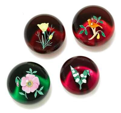Comprising a Partridge in a Pear Tree; a California Yellow Poppy; a Lily of the Valley, all on a red ground; a forget-me-not sprig with three cane flowers and buds, leaves and stem, in clear glass; and a Iowa Wild Rose with bud on a green ground.(5).